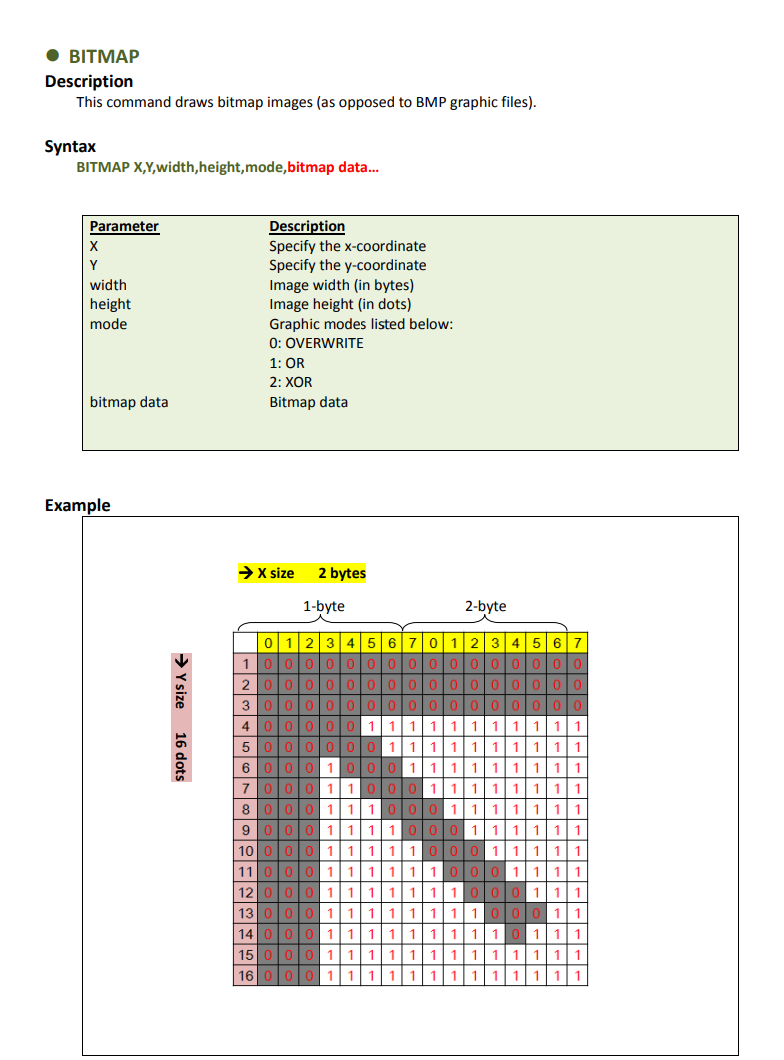 At the end you have a Buffer of bytes containing pixel data that you can add to the end of your BITMAP line. To verify my results, I re-created the image that's the same as the example from the manual. I start with the same 16x16 image, but paint it on a canvas that's 800x1198, the same as our output label so we can get a 1-to-1 pixel mapping when we print.